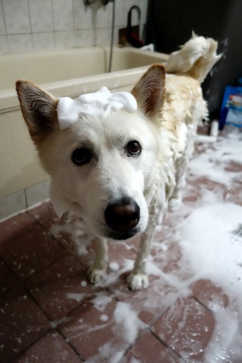 오늘은 심바 목욕하는 날..ㅋㅋ 거품을 머리에 올리고.ㅋㅋ