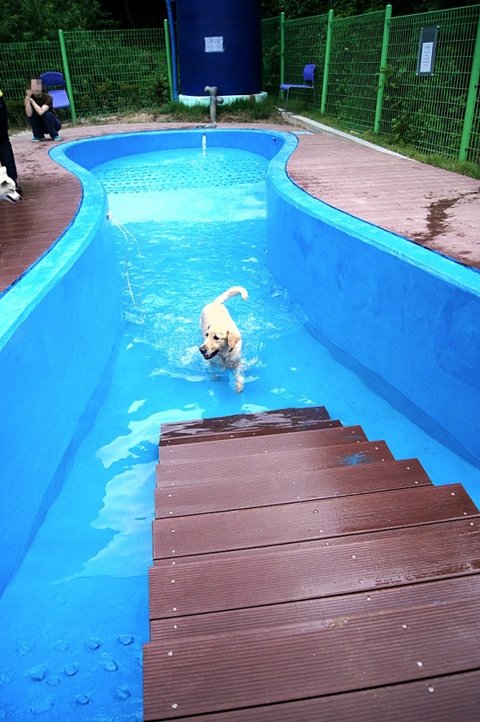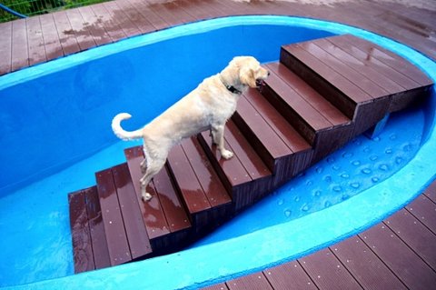 수영장을 새로 수리했다고 했거든요. 계단을 만들었네요 주변에 나무 데크도 깔고