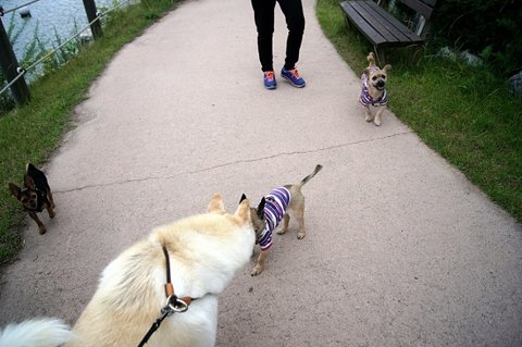 자유롭게 산책하는 세마리 멍멍이를 만났어요.