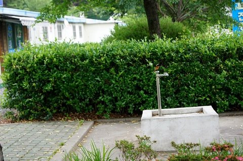 물 먹으러 왔는데 수도 꼭지 위에 작은 새가 앉아 있었어요.