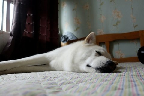 아까 산책하고 바로 와서 그런지 좀 피곤했는지 누웠어요.