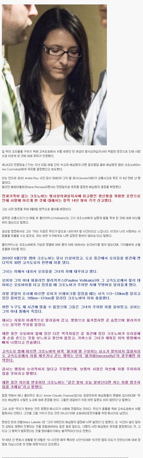 오리를 구하려고 차를 세웠다가 사람을 죽인 여성 종신형
