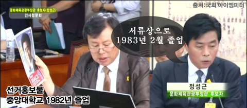 새정치민주연합 도종환 의원이 왜 선거홍보물에 1982년 졸업이라고 기재했느냐고 묻자, 정성근 후보자는 '서류상으로 1983년 2월 졸업했다'고 답변했습니다.