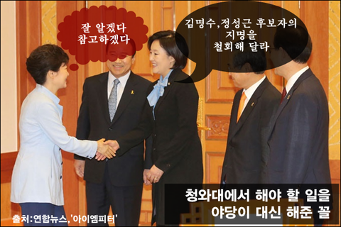 7월 10일 박근혜 대통령은 여야 원내지도부와 첫 회동을 했습니다. 이 자리에서 박영선 원내대표의 '김명수,정성근 후보자의 지명을 철회해 달라'는 요청을 했고, 박근혜 대통령은 "잘 알겠다. 참고하겠다"고 말했습니다.