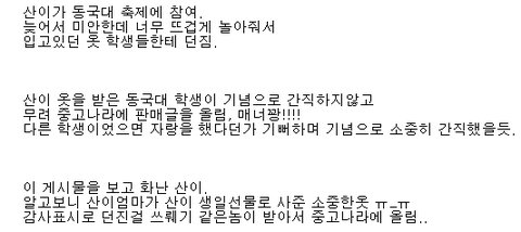 아니 ㅋㅋ 소중한옷이니까 팬들 고마워서 던졌더니 그걸 저렇게 팔아먹을려고하니까 저러는거지 뭔 그렇게 소중하면 던지질 말았어야지라니 ㅋㅋㅋㅋㅋㅋ어휴