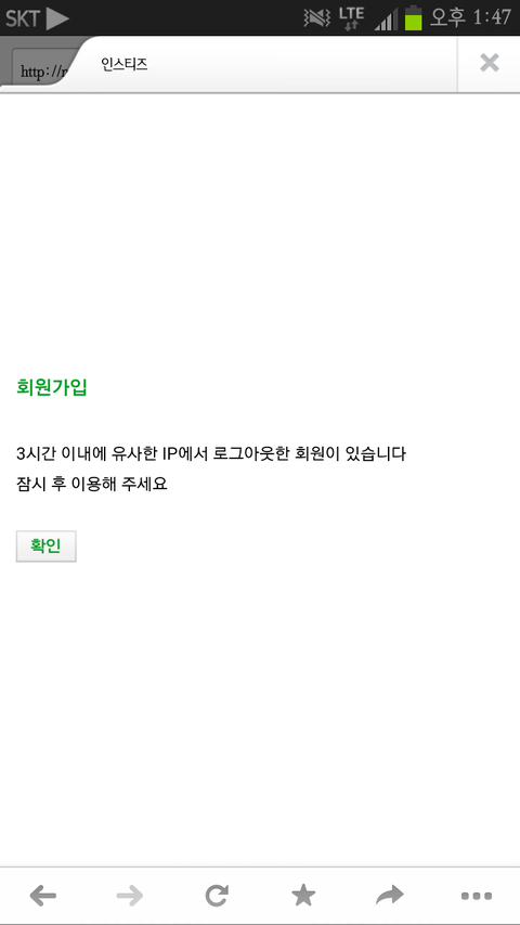 이런식으로 창이 뜬거임 그래서 한참있다 클릭해도 계속 똑같은 내용의 창만 뜸; 근데 중요한건 내 데이터를 키고 접속을 했을때만 그런 창이 뜬다는 거야 와이파이 연결하고 접속하면 그냥 회원가입기간이아닙니다 라는 평범한 창만 뜸