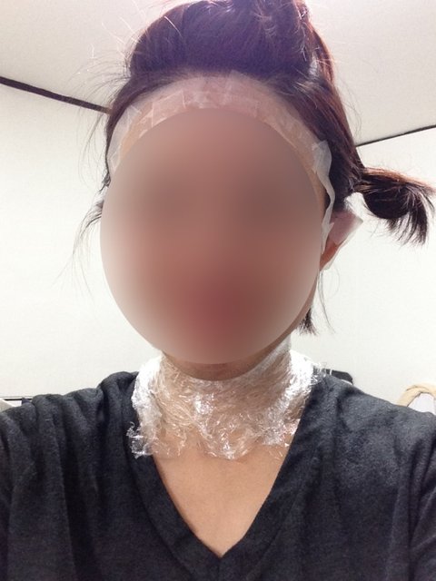 고무줄로 헤어 섹션을 나누고, 이마, 목, 귀에 묻지 않도록 비닐로 꽁꽁 싸매줍니다 : -)