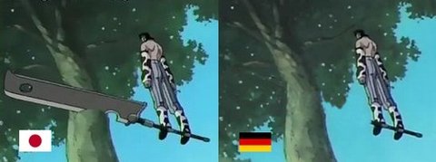 독일은 전범국. 나치에대해 매우 부끄러운 과거로 여기고 반성하며, 다시는 이런일을 반복하지 않기위해 교육도 철저히 하고 게임 연화 만화등의 매체에서 칼.총같은 무기나 전쟁의 뉘앙스를 보이는걸 철저히 검열한다고 하네요. 나무가 아플까봐 칼을 지운건 ㄴㄴ