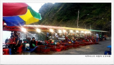 관음도를 지나 천부리로 향해 걸어간다. 울릉도 해안 길은 감탄사를 연발할 정도로 절경을 자랑하고 있었다. 천부 항에 도착해 아침 겸 점심을 하기로 했다. 7,000원 짜리 백반으로 식사를 해결한 후 바로 앞 구멍가게에서 옥수수 막걸리 한 통과 소시지 두 개를 산 후 가까운 방파제에서 잠시 휴식을 취했다. 방파제에서 막걸리 한 잔을 들이켜고 있는데 자전거를 탄 어린아이가 다가왔다. 아이는 머뭇거림 없이 내게 이것저것 묻더니 캔커피 하나만 사달라고 한다. 순간 어이는 없었지만, 아이의 행동이 재미있기도 해서 함께 구멍가게로 갔다. 어린놈이 무슨 커피를 마시느냐며 가벼운 핀잔을 주고 다른 음료수를 마시라 했더니 끝내 캔커피를 고른다. 그리곤 함께 다시 방파제로 돌아가 건배를 해가며 나는 막걸리를 아이는 캔커피를 마시며 나른한 오후의 시간을 보냈다.