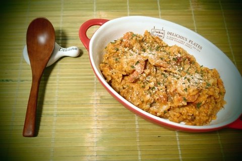 이건 레이먼 킴의 봄나물 리소토를 응용하여 만든 매운 새우리조또 입니다.