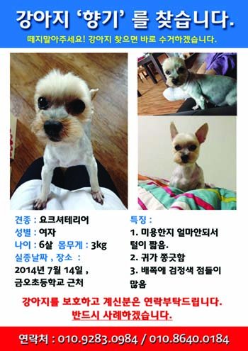 2014.07.14 에어컨 수리하시는 아저씨가 문을 열어놓으셔서 강아지가 나갔습니다. 이사온지 일주일도 안된 주택이라 더욱 걱정됩니다.