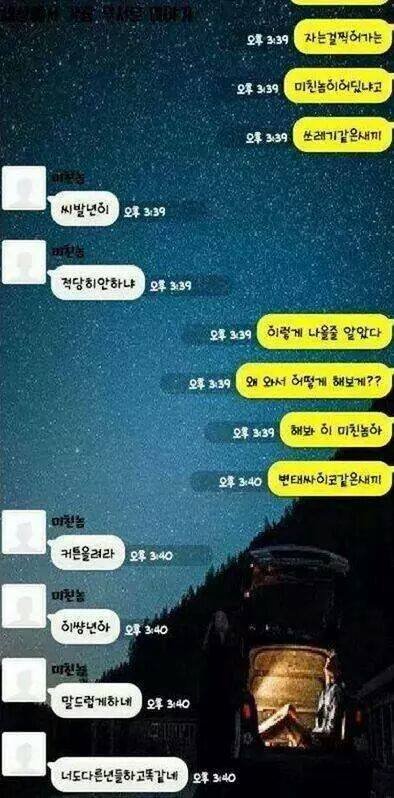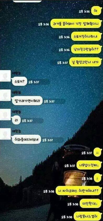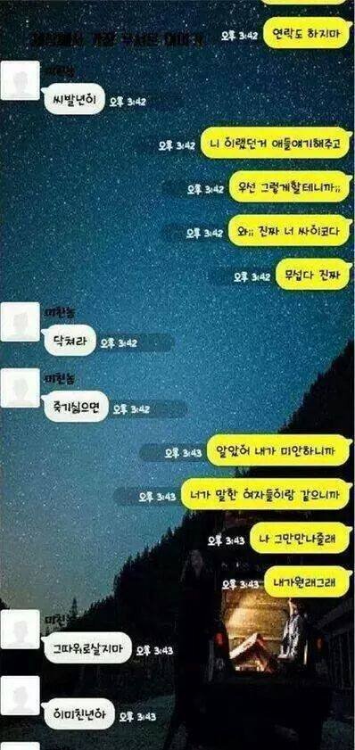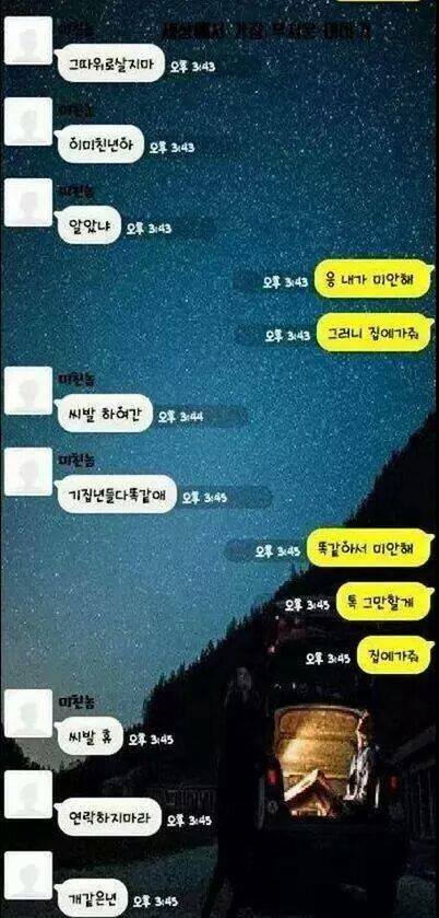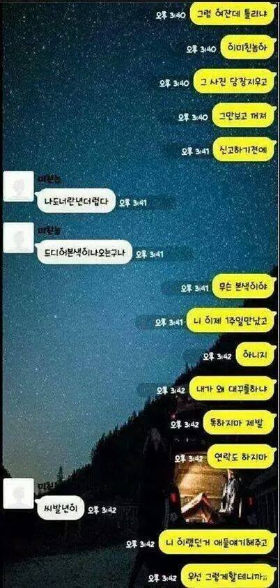 아....씨.발...... 전남친 새ㅡ끼 생각나네 씨.발진짜.... 저딴 새키들은 말투랑 욕 종류도 똑같은거 같네. 아...진짜...소름돋고 미친.... 후... 혐오다 정말.. 아직까지도 연락 오는데 스팸함에 새 메시지 있음 심장이 쿵쿵 떨어짐 정말로. 요즘 전남자친구 살인 사건 많이 일어나는데 그런 기사 볼때마다 진짜 심장이 오그라들고 내가 정신병 생길거 같습니다.... 갑자기 또 언제 미쳐 돌아가지고 몹쓸짓 할까봐....... 아...진짜 남자든 여자든 사람 잘 가려가면서 만나세요. 좋은 사람들만 만나는 것도 복입니다