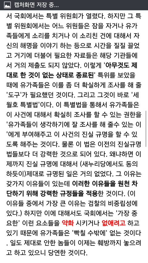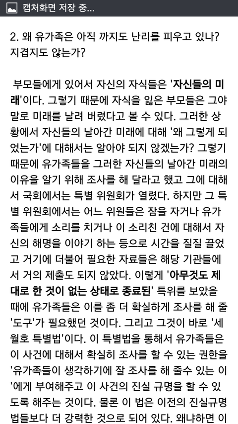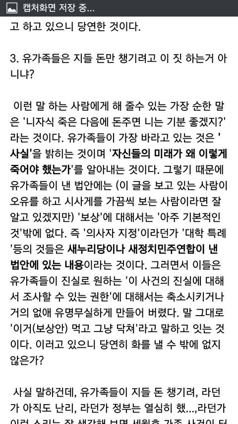 유가족들은 '이제' 대학에 갈 자녀들이 없습니다. '없는' 자식들 특례입학이 뭔 소용이 있습니까?? 단원고 생존자학생들의 특례입학은 유가족의 뜻이 아닙니다. 유언비어를 퍼뜨려 여론을 악화시키고 진상규명, 재발방지 대책을 어물쩡 넘어가려는 국회의 짓입니다.
