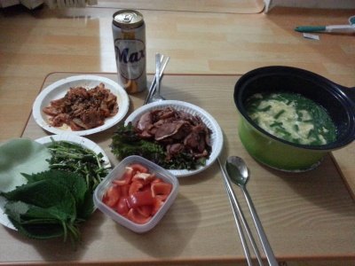 간단하게 오리구이와 계란국 김치볶음 야채와 함께 촵촵촵