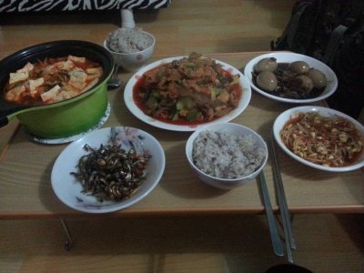 김치찌개(단골메뉴), 멸치볶음(시어머님표), 콩나물무침, 제육볶음, 계란장조림