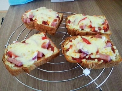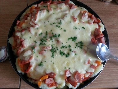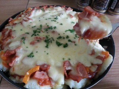 삶은 감자 으깨고 토마토 소스 발라서 양파,파프리카,햄넣고 피자치즈 올리면 끝.