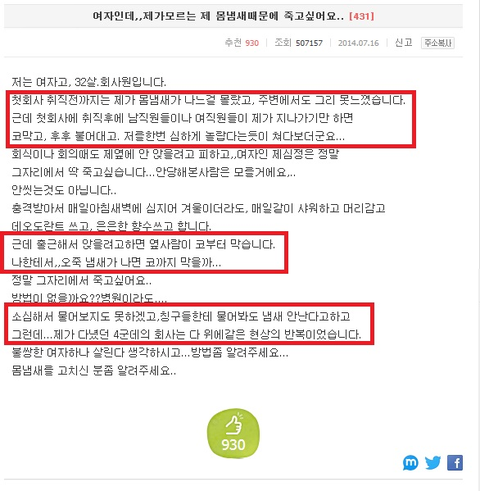 냄새 때문에 고민인 여자