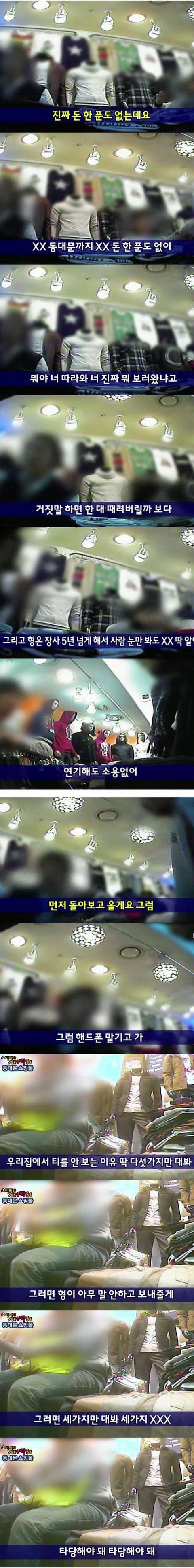 엄마 오빠 언니랑 동대문 갔었는데 호객행위가 여자보다 남자가 더 심했었음. 여자직원들은 그냥 보고있는데 남자직원들은 우리 오빠보고 여기 와서 좀 보고 가라고 여기 싸게 해 준다고 소리치고 난리났었음.