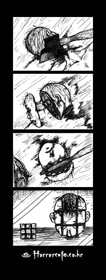 첫번째는 남자가 지나갈 때엔 켜진 현관등이 할머니가 지나갔을땐 켜지지 않았음. 두번째는 옥수수(콘) 캔에 베였는데 손에서 옥수수 싹이 자람. 아마도 베인 상처로 옥수수가 들어갔나봄.....ㅜㅠ 세번째는 잘 모르겠는데 얼굴을 쪼개서 큐브처럼 만든것같아요.....으악