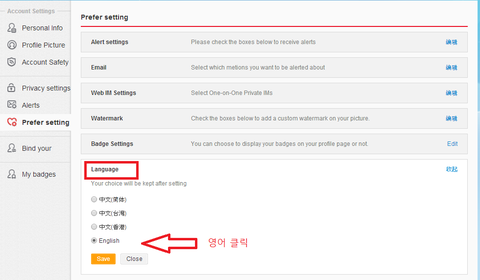 그 것이 뜨지 않으면 이 상태 그래도 맨 밑의 english를 클릭하고 save 클릭해주면 언어설정 완료!