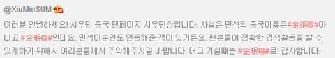 그리고 글을 간단하게 시우민 사랑해요! 이렇게 쓰거나 사진을 올리고 태그에 #金珉硕# #XIUMIN# #秀珉# 이렇게만 해줘도 너무 좋다네 ㅠㅠㅠㅠㅠ