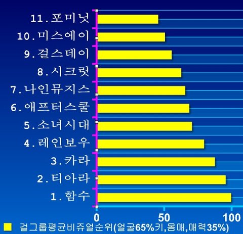 4위)레인보우 = 전멤버가 평균이상. 전멤버가 싼티나기도함(매력지수 부족)