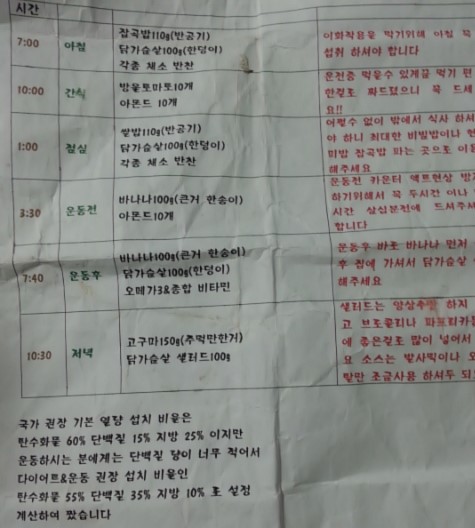 이게 바로 제가 제일처음 다이어트를 시작할때 담당 트레이너 쌤께 받은 식단입니다