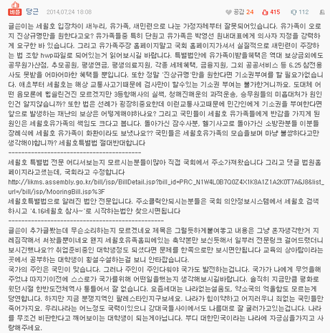 세월호 특별법에 대해 대학생이 글단 건 비판의식을 가진 깨어있는 대학생을 생각해서 하는 말이고 국내외 상황은 알아서 잘 돌아가니 이 글을 남긴다 -> 글 내용은 사람이 아닌 돈을 생각해야한다. -> 현재는 가장 평화로운 시기이다 -> 강대국 사이에 나라가 알아서 잘 굴러간다 (그러면서 현재 정치의 가장 큰 쟁점인 세월호 특별법에 대해 댓글을 길게 남긴다?) 왜냐고? 깨어있는 대학생을 생각해서 -> 그러니 부디 대한민국을 사랑해달라