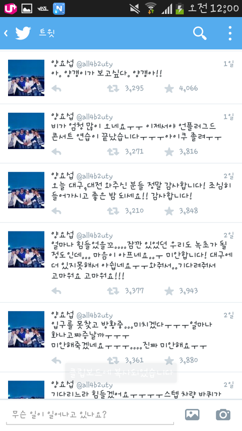 24일날 비스트 대구 팬싸 온거 솔직히 실망이였음ㅋㅋㅋ 공개팬싸라서 옥상?에서 해서 진짜 덥고 그 날은 또 37도까지 올라가서 사람 열사병걸릴 정도 였음 근데 원래 비스트가 1시에 오기로 되어있었는데 3시 반에 도착함 솔직히 오는 도중에 펑크도 나고 했으니까 늦은건 어느정도 이해함 근데 와서 태도 조카 실망 7~8시간 동안 비스트 하나 볼려고 팬들이 더운데도 참아가면서 기다렸는데 계속 불러도 인사해주는건 윤두준, 양요섭, 손동운밖에 없고 특히 이기광이랑 장현승은 표정 진짜 안좋았음ㅋㅋ 막 비스트 팬싸 후기보면 개쩔든데 너무 기대가 컸나봄