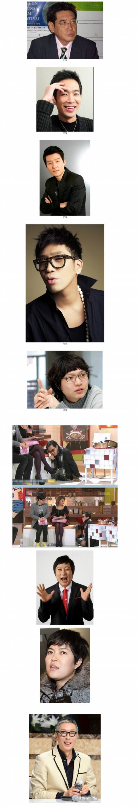 조형기-술마시고 뺑소니해서 사람죽인데다가 시체유기 그래놓곤 방송에나와선 내가맨정신으로한것도아닌데 그게 죄가되냐 라고 개소리ㅋ 고영욱-전국민이아는국민쓰레기 말로표현이안됨 이현우-대마초에 군면제받고 음주운전 그랜드슬램달성 엠씨몽-생니뽑고 병역기피받앗지만 무죄이므로 저정도 라인급은안되는듯 (차라리박봄을ㅋ..) 신정환-필리핀원정도박에 댕기열걸렷다고 전국민에게사기침 게다가 최근 사기혐의로 조사중 조영남-일본에가서 자기책팔려고 일본이 우리보다 한수앞서있다는 친일발언 이수근-도박에이어 매니저와함께 여성성폭행 조혜련-말이필요없는매국노 일본에서 한국비하발언 쩔게함 서세원-자신의부인 서정희에게 폭행과폭언 자기딸뻘의 내연녀잇고 자기딸에게도 폭언 현존연예계 최강라인업 인정ㅋ