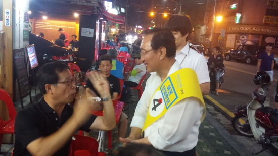 얼마 전에 개업했다는 꼬치구이집에 들른 노회찬 후보.