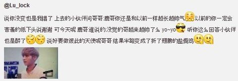 사인 받던 팬이 "루한오빠 여전히 예전처럼 잘생겼어요!"라고 하자 예전이었다면 쑥쓰러워서 고개 숙이며 고맙다고 했을텐데 오늘은 "누가 그래, 오빠 점점 더 잘생겨진 것 같지 않아? yo~yo~"