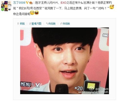 MC가 레이에게 앞으로 EXO 어디 순회공연 계획되어 있냐고 묻자 그는 아주 정상적으로 "8월2일 서안이요" 라고 답한 후 잠시 멍~ 하더니 곧바로 이 표정으로 물었다 "맞아요?"
