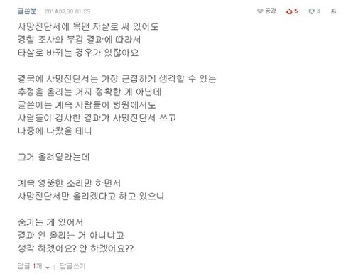 어떤 분이 사망진단서 얘긴 그만하고 조직 검사 결과를 밝혀라 뭘 숨기려 드느냐며