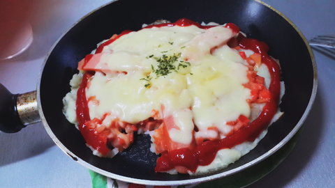 4. 후라이팬에 기름을 둘러 주시고 으깬 감자를 펴주세요ㅎㅎ그러고 위에 토핑과 치즈 데코를 하신뒤 뚜껑닫고 치즈가 익길 기다려주세요 센불에 하시면안대요ㅠㅠ중간이나 중간이랑 약불 사이정도?? 집마다 불세기를 몰라서 이건 조절해주셔야 될것같아요ㅠㅠ