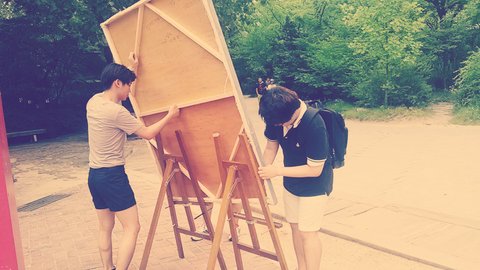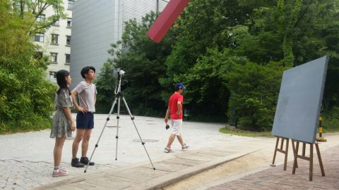 지난 7월 6일, 홍익미술전 홍보부 기획단들은 이번에 진행 중인 소셜크라우드 펀딩 시스템인 ’텀블벅’ 페이지에 올라갈 홍보 영상을 찍기 위해 방학인데도 불구하고 (!) 학교로 모였습니다~! 영상을 찍기 위해 영원한 미소라고 불리는 유명한 조형물 앞에 커다란 캔버스를 설치했습니다. (날이 더운데다가 캔버스가 너무 무거워서 끙끙대며 옮겼네요ㅠ_ㅠ)