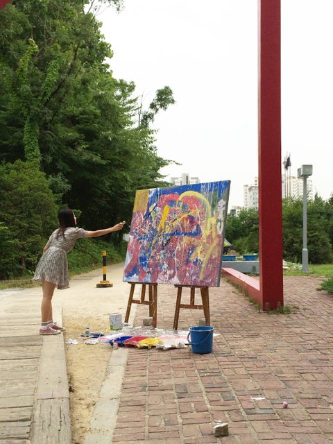 그리고 홍대로 놀러 온 분들께 함께 캔버스를 채워달라는 부탁을 드리며 함께 영상을 완성해갔습니다. 저희가 지나가는 분들에게 부탁을 드리면 처음엔 어색해 하시다가도 막상 붓을 쥐어드리면 색들을 섞어서 멋진 획을 그어주셨습니다.