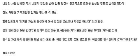 크리스찬으로써 정말 어이가 없고 화가 나서 그러는데요. 동성애자를 이해하고 인정하면 그게 진보 개방형 기독교인입니까? 어째서 그렇게 되는건데요. 성경에서는 동성애를 허락한 적이 없습니다. 고쳤다구요? 한혜진씨가? 뭘 고치는데요? 유전적인 문제도 아니기에 이렇게 논란이 계속 되는거 아니겠어요? 기독교에는 진보 개방형? 그런게 납득이 될 것 같습니까? 어떤 성경에도 동성애를 받아들이는 사상을 가진 기독교이면 진보개방형이다라는 파도 나위어져 있지 않아요. 뭔가 착각하시는 거 같은데 동성애를 인정하지 않는게 구시대적 발상이라구요? 오히려 크리스찬이면서 동성애를 옹호하는 것이 더 악한 죄라고 생각합니다. 요즘 이단 문제도 많고 기독교가 개독교라고 불리는 사건들이 많은데 여러분들도 교회는 그러면 안된다 라고 생각하기 때문에 교회문제에 더 민감하신 거 아니겠어요? 세상이 정말 잘못 굴러가고 있는 것 같습니다.