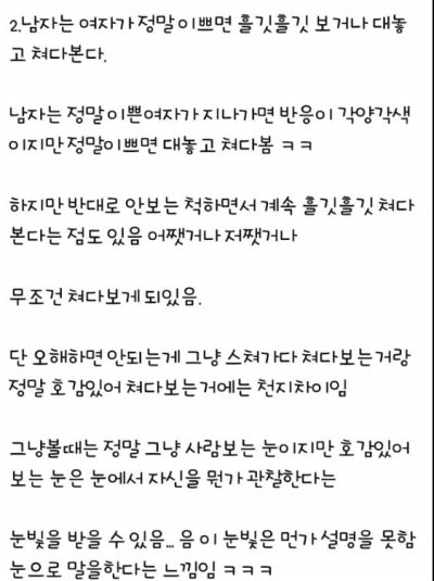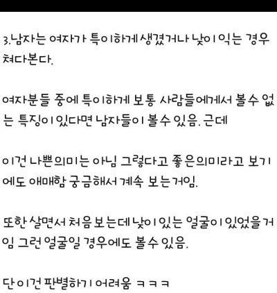 난 남자긴한데 이건 여자도 거의 똑같을듯. 디테일만 더 들어가고... 예를 들면 옷이나 스타일이나 센스 같은 것까지 판단하는거...