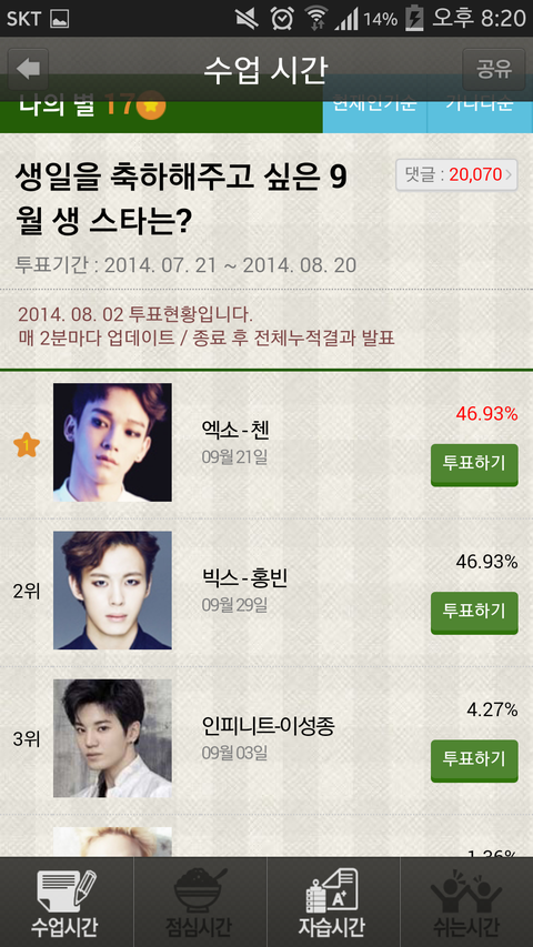 나도처음엔 귀찮겠다 싶어서 미루다가 저번주부터 하고 있는데 어플만깔면 투표바로가능해ㅜ 어제도 그제도 다 졌어ㅠ 이거누적으로 하는거라 앞으로 계속 이기면 충분이승산있어 이때까지 진것도 기껏해야 2~3프로 차이로진거라서 더안타깝다 다들ㅠㅠ종대 생일축하 제대로 해주자ㅠ 팬덤스쿨 깔면돼