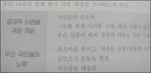 초등학교 교과서부터 고등학교 교과서까지 저렇게 언급하고 있습니다 대기업에 은행이 무리한 대출을 해주고 외환 보유고 빵구내서 경제 쫄딱 말아먹어놓고 국민탓으로 돌리는 정말 미개한 정부