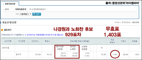 동작을 나경원 후보는 2위 노회찬 후보와 929표 차이로 겨우 승리했습니다. 무효표 1,403표만 아니었으면 질 수도 있었을 상황입니다. [각주:1]