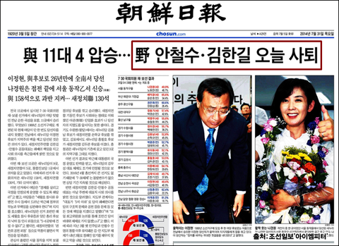 2014년 7월 31일 오늘 조선일보 1면의 머리기사는 '안철수,김한길 사퇴'입니다. 7.30재보선 결과를 놓고 새정치민주연합 안철수.김한길 공동대표가 사퇴할 것이라는 예측은 하겠지만, 이것이 전부는 아닐 것입니다.