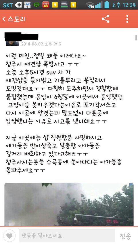 수곡동 살아요... 집에서 밥먹는데 펑! 소리나더니 열어놓은 창문으로 탄냄새가 들어오더라구요... 저희강아지 다니던 애견샵이거든요... 저녁에 남자친구랑 사료사러 갔는데 놀랐어요... 폴리스라인쳐있고 아예 알아볼수도 없게 2층건물이 다 전소됬구요... 한참을 멍하게 보다가 맞은편 애견샵에서 사료사는데 거기 사장님께서 최초 목격자에 최초신고자셨어요... SBS에서 연락와서 인터뷰요청 하더라구요... 사고 당시 아가들 살릴려고 누가 불에 털끄실른 강아지 막 살리려고 얼굴이 새까매질 정도로 왔다갔다 했다고 들었 습니다... 수곡동에 강아지들이 떠돌고있나요? 저희도 반려견 키우는 입장에서 유심히 지켜보고 떠도는 강아지가 있으면 데려와서 그 샵 체인점에라도 연락드릴께요... 단골샵이였는데... 꽃다운 스무살에 희생되신 분... 고인에 명복을 빌겠습니다...▶◀