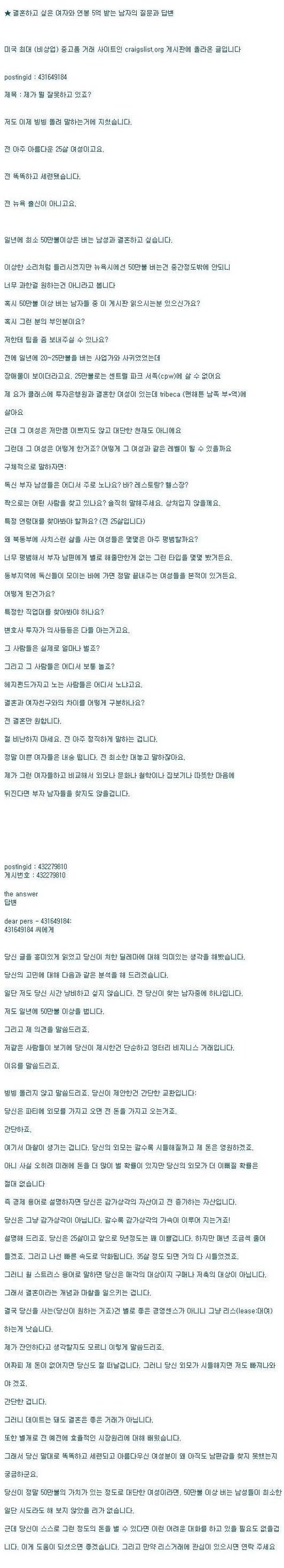 글은 미국 최대 (비상업) 중고품 거래 사이트인 'craigslist.org' 게시판에 'What am I doing wrong?(제가 뭘 잘못하고 있죠?)란 제목으로 올라온 것이고..그에 대한 한 남자의 답변입니다