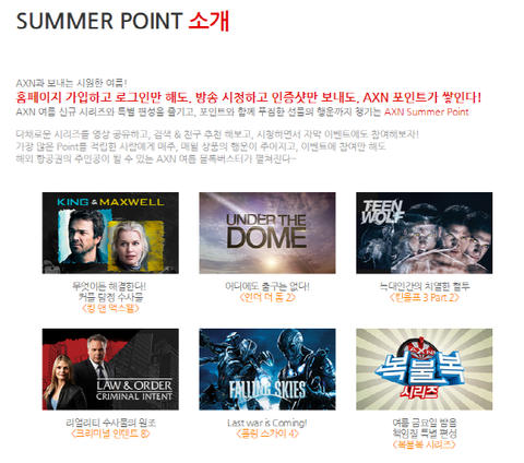 그러다가 AXN 채널에서 언더더돔이라는 드라마를 하는 걸 알고요새 재밌게 보고 있는데 스케줄 체크하러 AXN 공식 홈피 들어갔는데AXN Summer Point 이벤트를 하고 있는 걸 알았어요 크크