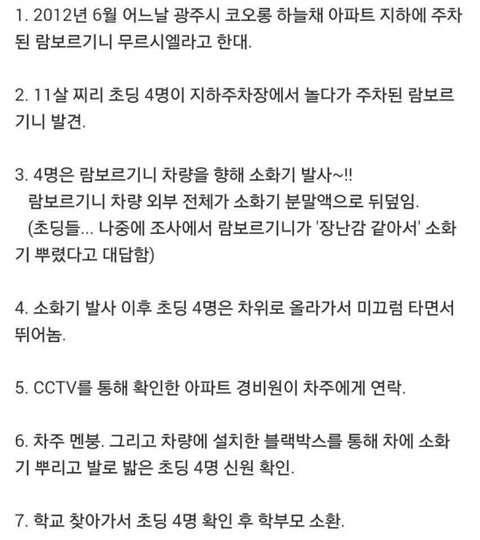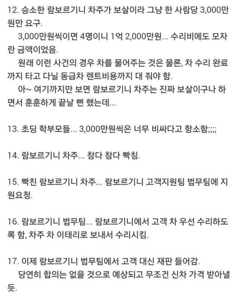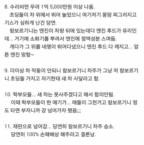 저 부모들은 람보르기니 차주가 부자라고 돈 많으니까 봐줄꺼란 생각은 참ㅉㅉ 부자여도 그건 람보차주 사정이고 멀쩡한 차를 고장내놓고 합의해줄때 알아서 감사합니다하고 넙죽기었어야되는데 결국 다물어주게 생겼네