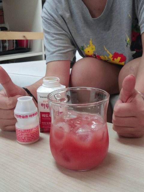 간단해여 하루야채 레드?랑 야쿠르트 섞으면 되여 색깔이 되게 이뻐서 좋아하더라그여