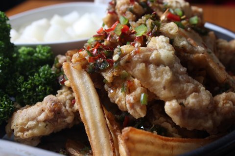 바삭바삭한 튀김옷은 기본이고 HOT한 고추 마능 소스가 뿌려져 있어서 매콤바삭!
