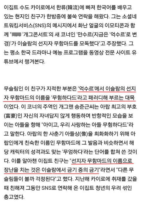 보면 개그맨들은 생각이 좀 짧은거 같아 이슬람이 어떤 종교인지 모르나? 알고도 저런다면 진짜 미친거고 빨리 뭔일 나기전에 사과하고 폐지하길